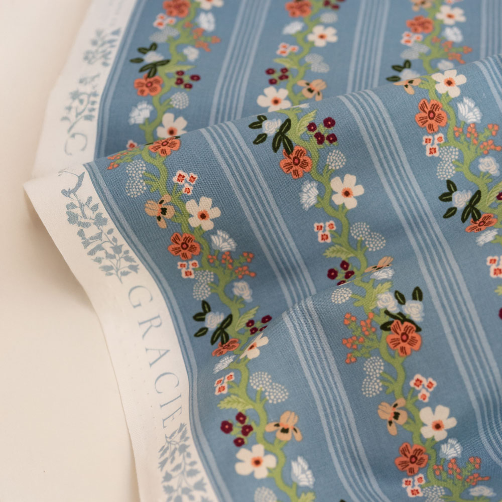 Der “Floral Trellis Stripe” von Rifle Paper Co ist ein hochwertiger Baumwollstoff aus der beliebten Gracie Kollektion. Das Design kombiniert florale Elemente mit einem klassischen Streifenlayout und schafft dadurch eine ruhige, dekorative Struktur mit besonderem Charakter.